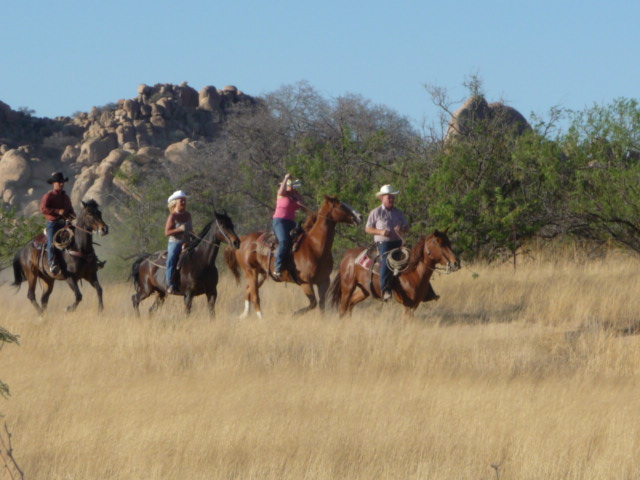 These rides cover more difficult trails, and offer the rider several opportunities to "lope" (or canter) through this amazing country. After their introductory morning Trail Ride, guests will be evaluated in the arena to demonstrate their ability to balance and control the horse at a loping speed before signing up for the Advanced Ride the following day. At the Triangle T, the rides cover rough terrain, so not all the time on these rides is spent loping.